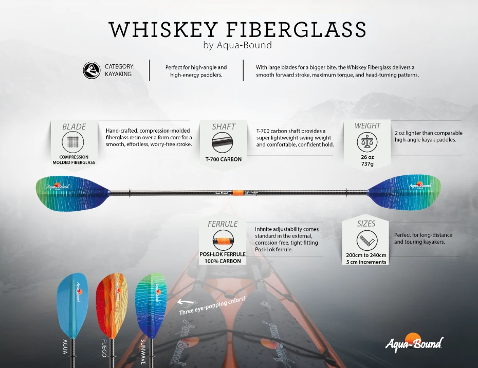 Award-winning high-angle horsepower and the smoothest stroke in paddles, the Whiskey Fiberglass makes all day trips less fatiguing.