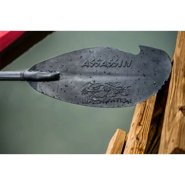 The Backwater Assassin Carbon Fiber Hybrid Paddle is the full-size version of its legendary predecessor, the Assault Hand Paddle. Weighing right at 38 ounces and 42 ounces, respectively, paddle design and technology is again moving forward! The Assassin is available in 2 different adjustable lengths: 230-240cm (90.5-94.5in) & 250-260cm (98.5-102.5). The Assassin kayak paddles not only display the patented “hook and teeth” blade design and raised graphics package, they also provide unsurpassed performance and versatility. The hook is great for grabbing a line in the water, pulling in decoys, pulling you closer to the dock, or making a tree limb easier to reach. The oversized blade helps to pull a lot of water when paddling and makes turning even easier. The Assassin is designed for form as well as function. The unique blade design allows kayakers more freedom, more comfort and more confidence to challenge themselves. The Assassin was designed for both high angle and low angle paddlers. The shaft is made of a carbon hybrid material to help reduce the overall weight and the oversized ABS injected nylon blade is hard enough to push off on any surface and not crack or flex. Is your lure stuck in a tree? No problem, just grab the branch. Too close to the rocks or oyster shells? No problem, just give a push.