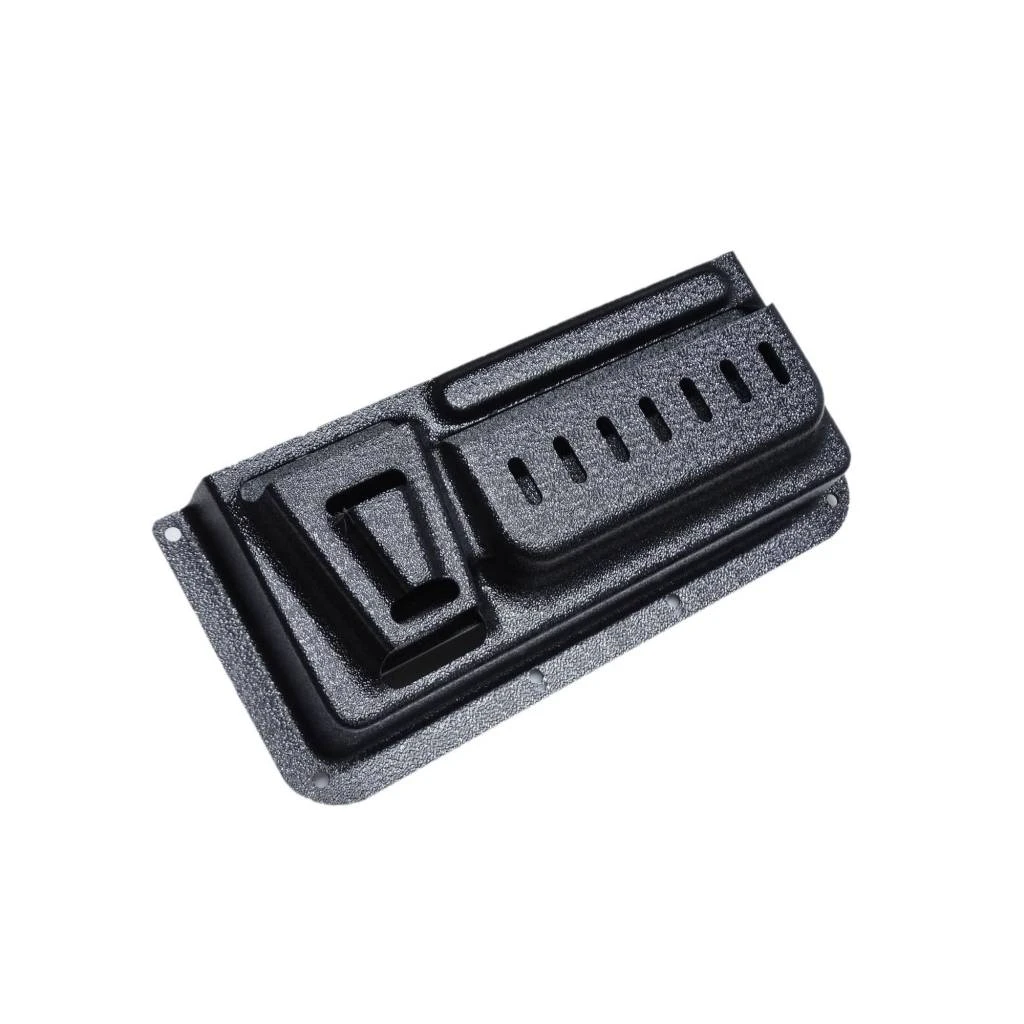 The Prison Pocket is a storage system designed to hold nearly anything. This has a large pocket to hold tackle boxes at the rear (275mm L x 118mm H x 45mm D) and a smaller pocket on the front to hold soft plastic pouches or smaller tackle trays (170mm L x 60mm H x 24mm D). The slots on the front of the small pocket are used for hanging jig heads or lures. The two formed Vs on the side are made for holding pliers, scissors and fish grips. This is formed from ABS plastic and can hold the following. We have a range of adaptors to suit seats, track mounts and much more!