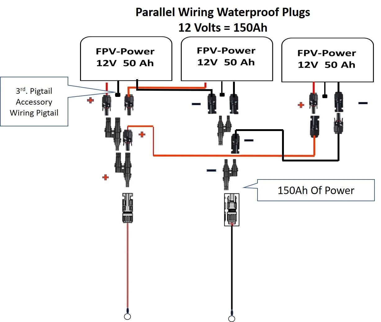 | Product Description | FPV-POWER 150AH V3 WATERPROOF LITHIUM BATTERY – (3) 50Ah V3 Batteries in Parallel / Parallel Wiring Harness -WITH (3)10AH CHARGER2 |