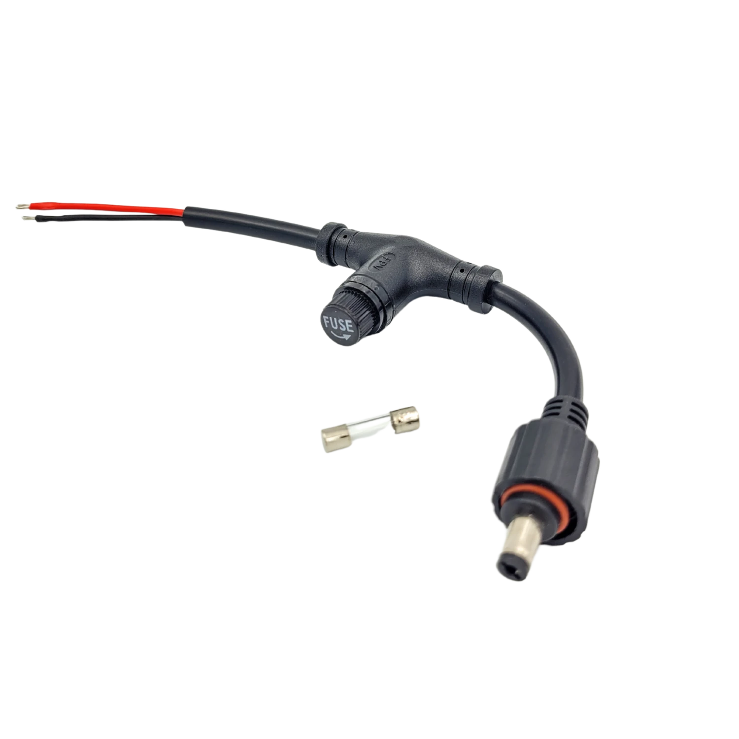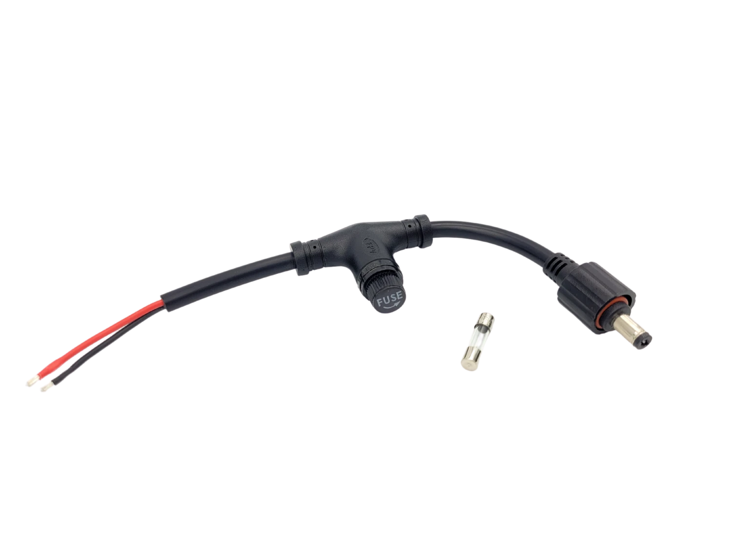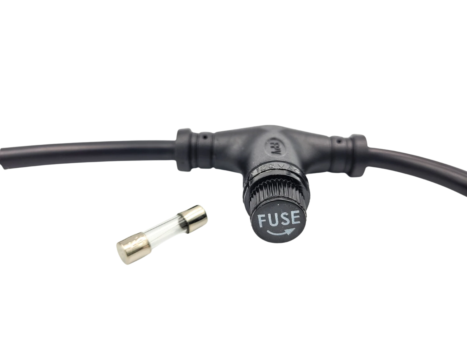 Plug and play Fused Pigtail, male head plugs into the battery with water tight fitting and the other end is bare wires to be wired with your FishFinder, Lights or other accessories. These holder uses 5mm*20mm glass fuse. This Fused Pigtail comes with 2 – 3A fuses.