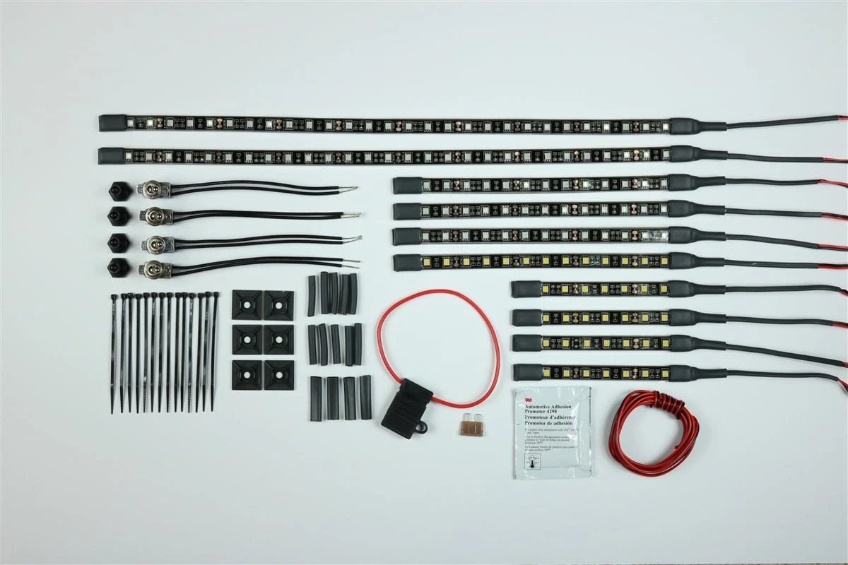 - 4- 6″ LED Light Strips with 7Ft. leads attached (Cabin area–2 strips next to each seat). These strips are warm white only.